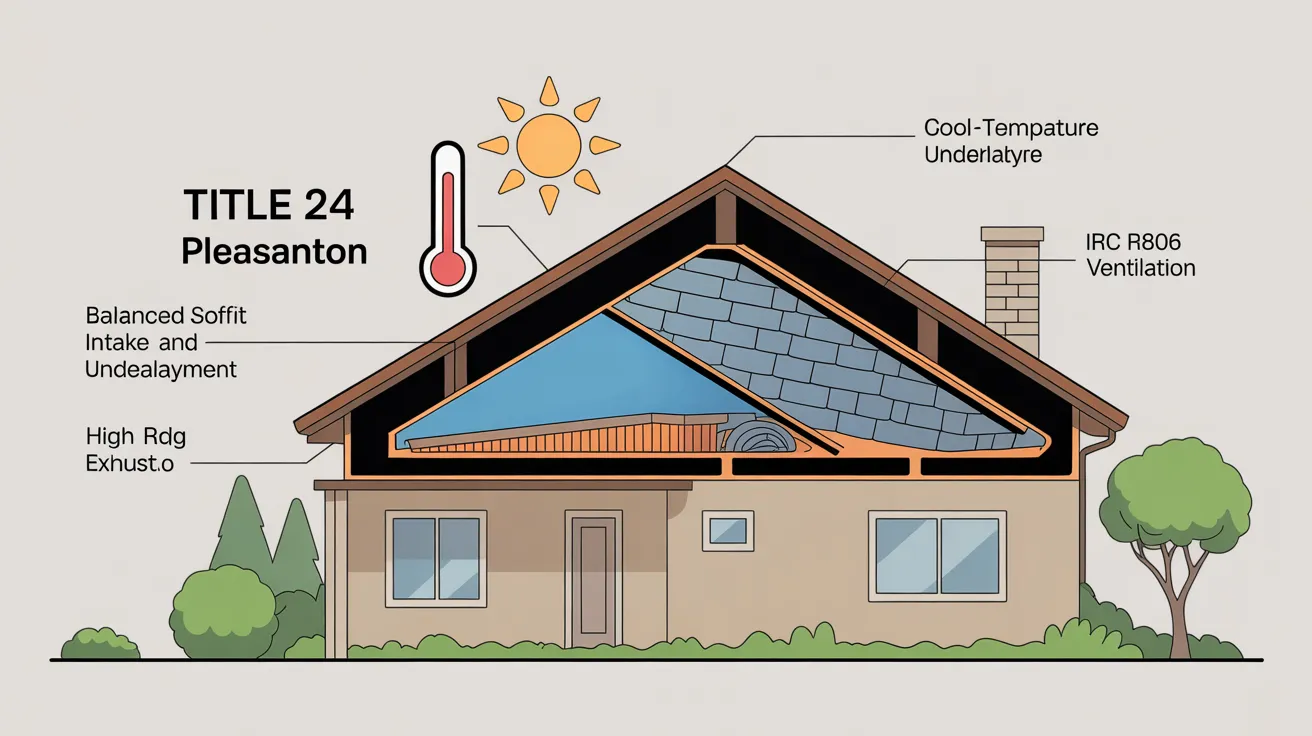 Choosing asphalt or metal determines the exterior surface, but roof performance in Pleasanton relies on how you configure ventilation and insulation as a system. You'll comply with code and prolong roof life by balancing intake and exhaust. Target net free area for attic ventilation at 1:150 (or alternatively 1:300 with a Class I/II vapor retarder), split about 50/50 between soffit intake and ridge exhaust. Use baffled vents to block wind-driven rain and maintain 1-inch clear air paths above insulation.